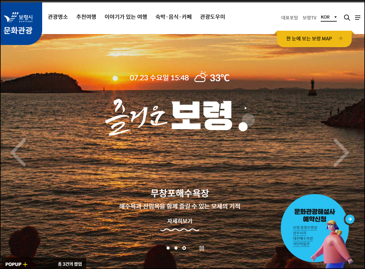 보령 대천해수욕장-무창포 해안도로는 탁 트인 바다를 감상하며 드라이브를 즐기기에 좋습니다. 대천 해수욕장에서는 다양한 해양 액티비티를 즐길 수 있으며, 무창포는 '신비의 바닷길'로 유명하여 물때를 맞춰 방문하면 바다가 갈라지는 기적을 경험할 수 있습니다. 신선한 해산물이 가득한 수산시장에서 맛있는 음식도 맛보시면 배로 즐겁습니다. 보령시 문화관광에서 상세한 정보를 확인해 보세요.